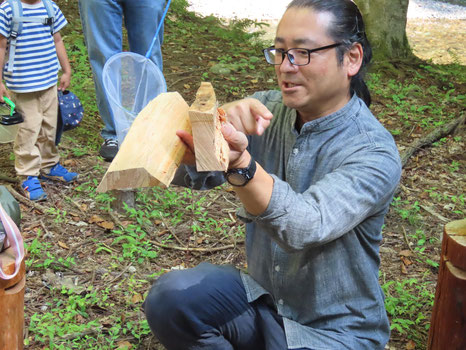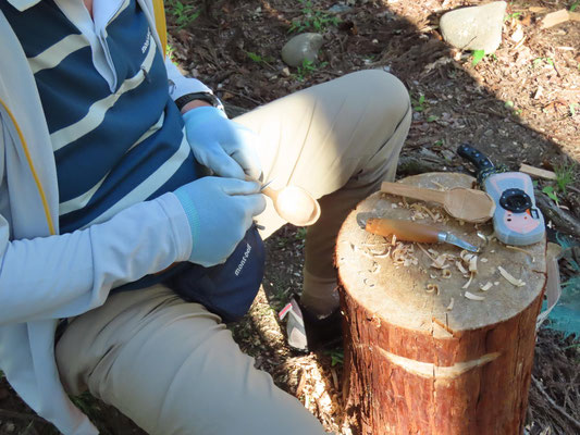 2025年9月27日(土)「木工ワークショップ・生木でつくるスプーン」を開催しました。講師は、「MORITOWAの一員として森の遊び場である音羽の森ジョイパーク」を運営する北川勇夫さん、場所は「同・音羽の森ジョイパーク」で開催。グリーンウッドワークでスプーンを作りました。